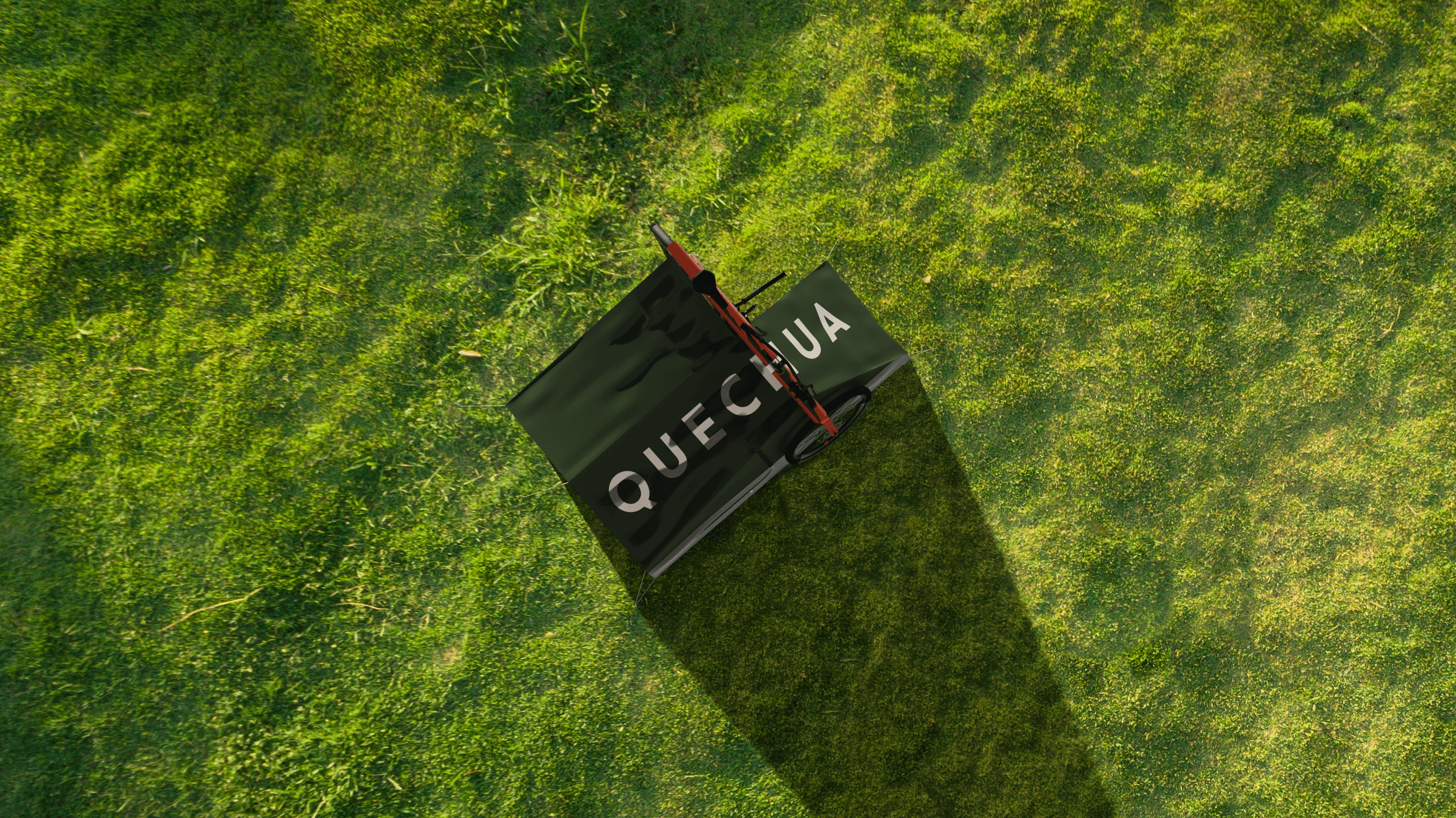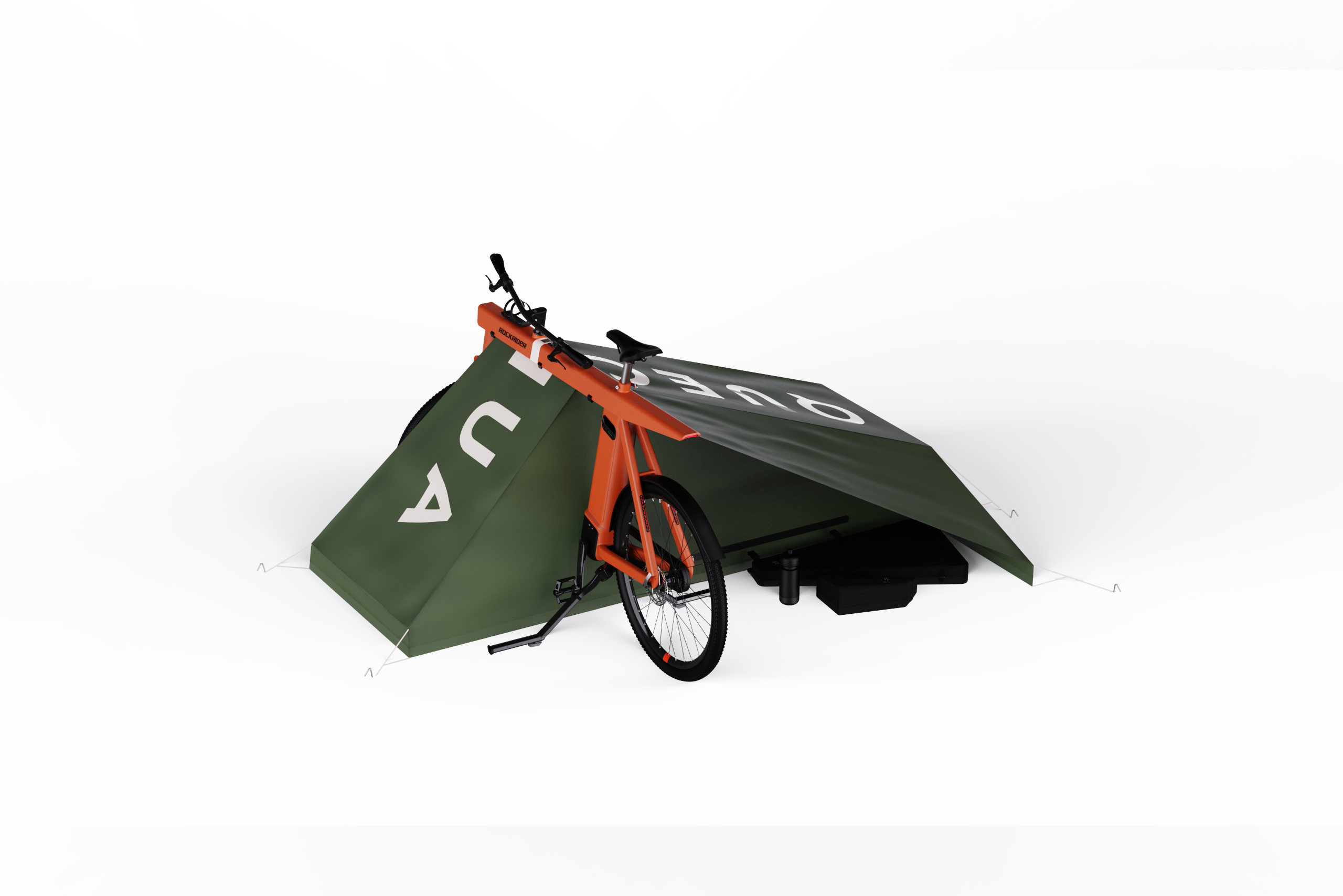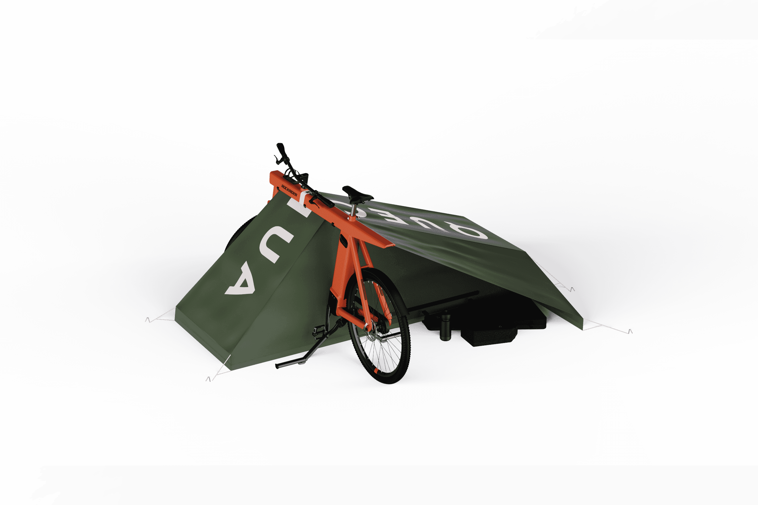 Decathlon asked us to design a new concept for their touring e-bike range. The central idea was to foster an internal collaboration between its two sub-brands, Rockrider and Quechua, to combine cycling and camping into one accessible object. TentBike makes bike camping accessible to people with all types of experience in the sport. The tent is stored inside the frame while riding, and when parked, the bicycle frame becomes the supporting structure of the tent. Designed as a rental system, the product could be picked up at a Decathlon store, fully equipped with all necessary camping gear packed in bike bags.