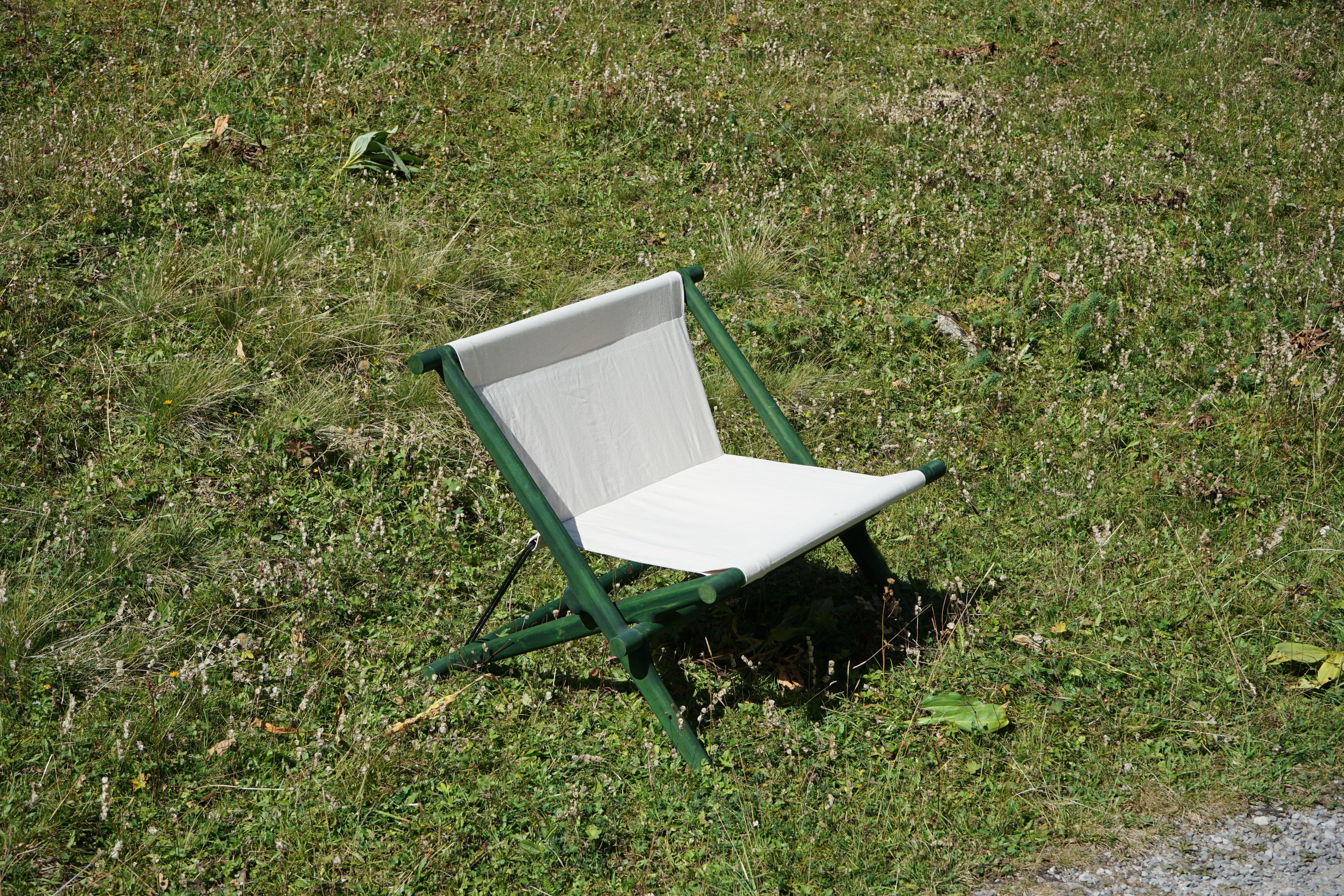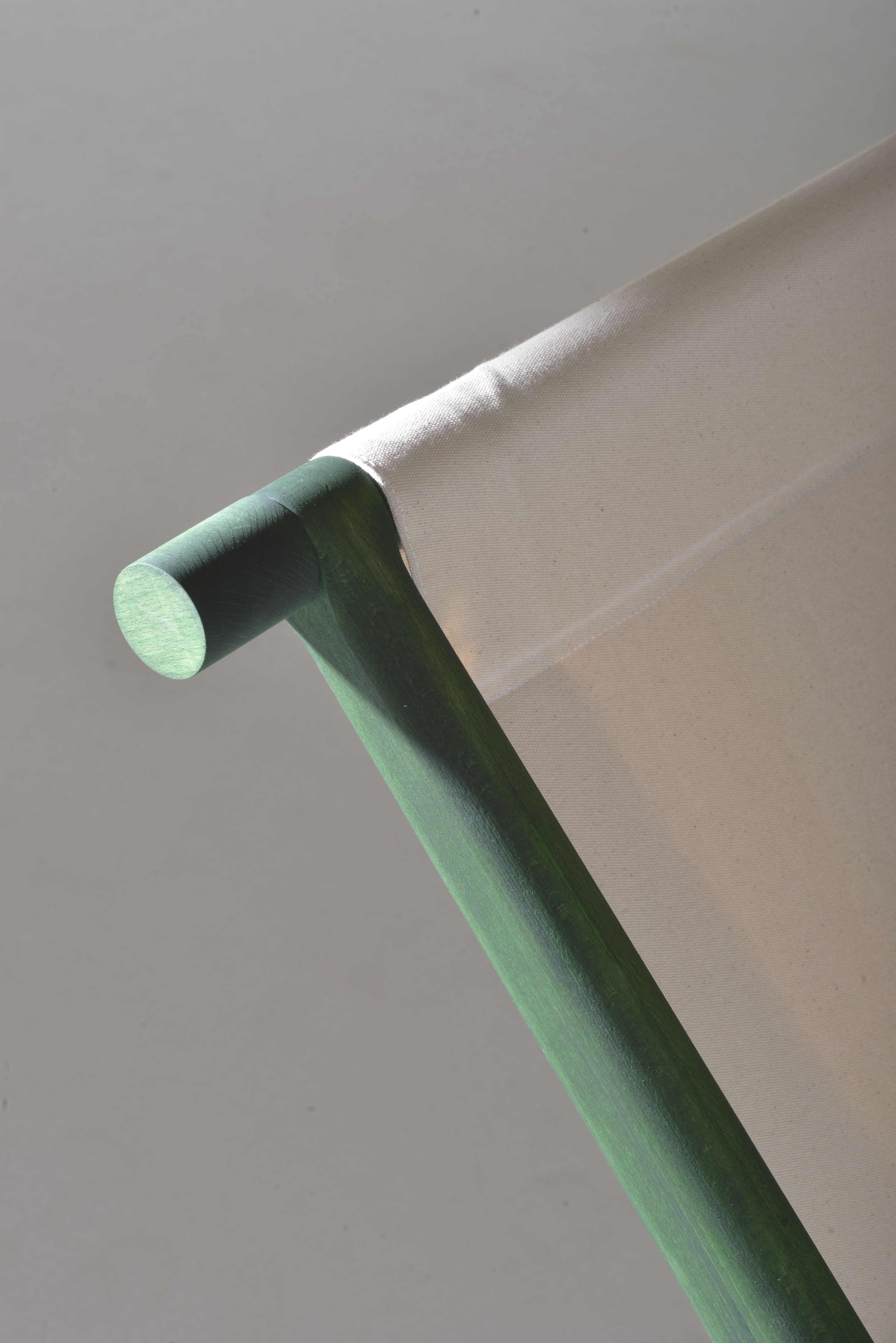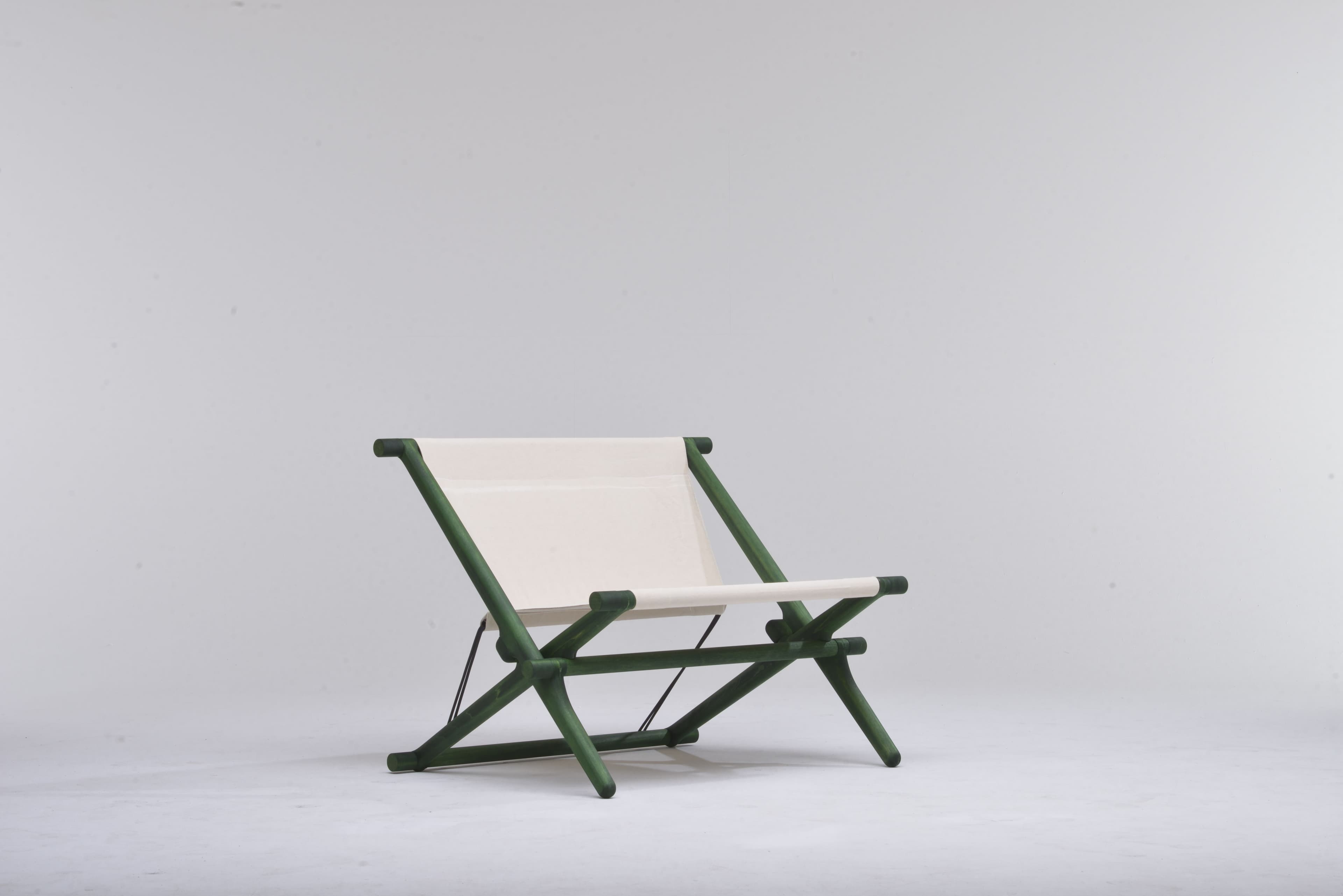 This furniture piece is knock-down and foldable, providing adaptability and ease of transport. A canvas sling stretches over the Beachwood frame, providing comfortable seating. The piece can fold to free up space or be fully disassembled and wrapped in the canvas component for easy transportation. It can be assembled and disassembled by hand with no tools thanks to the use of threaded dowels and wooden nuts.