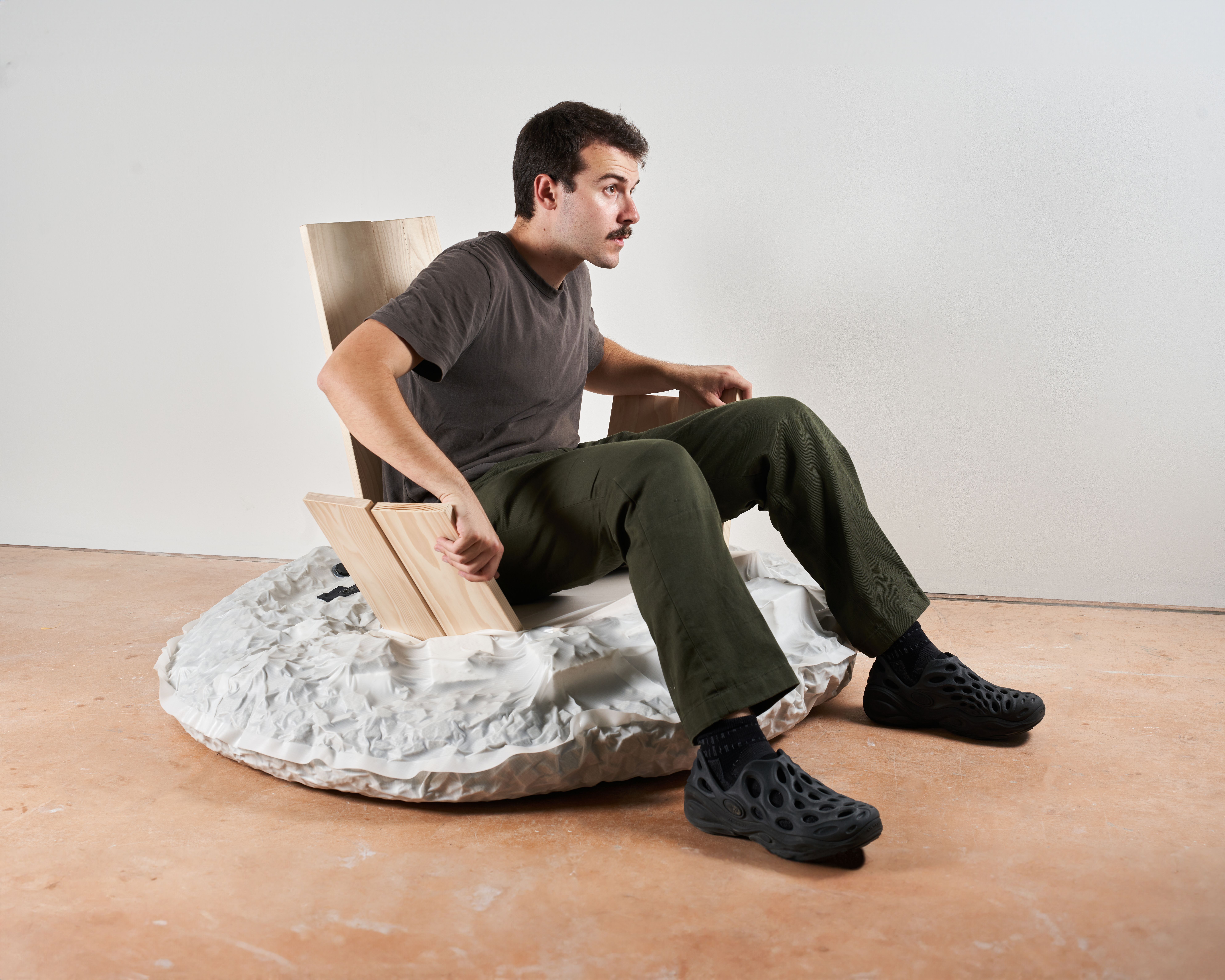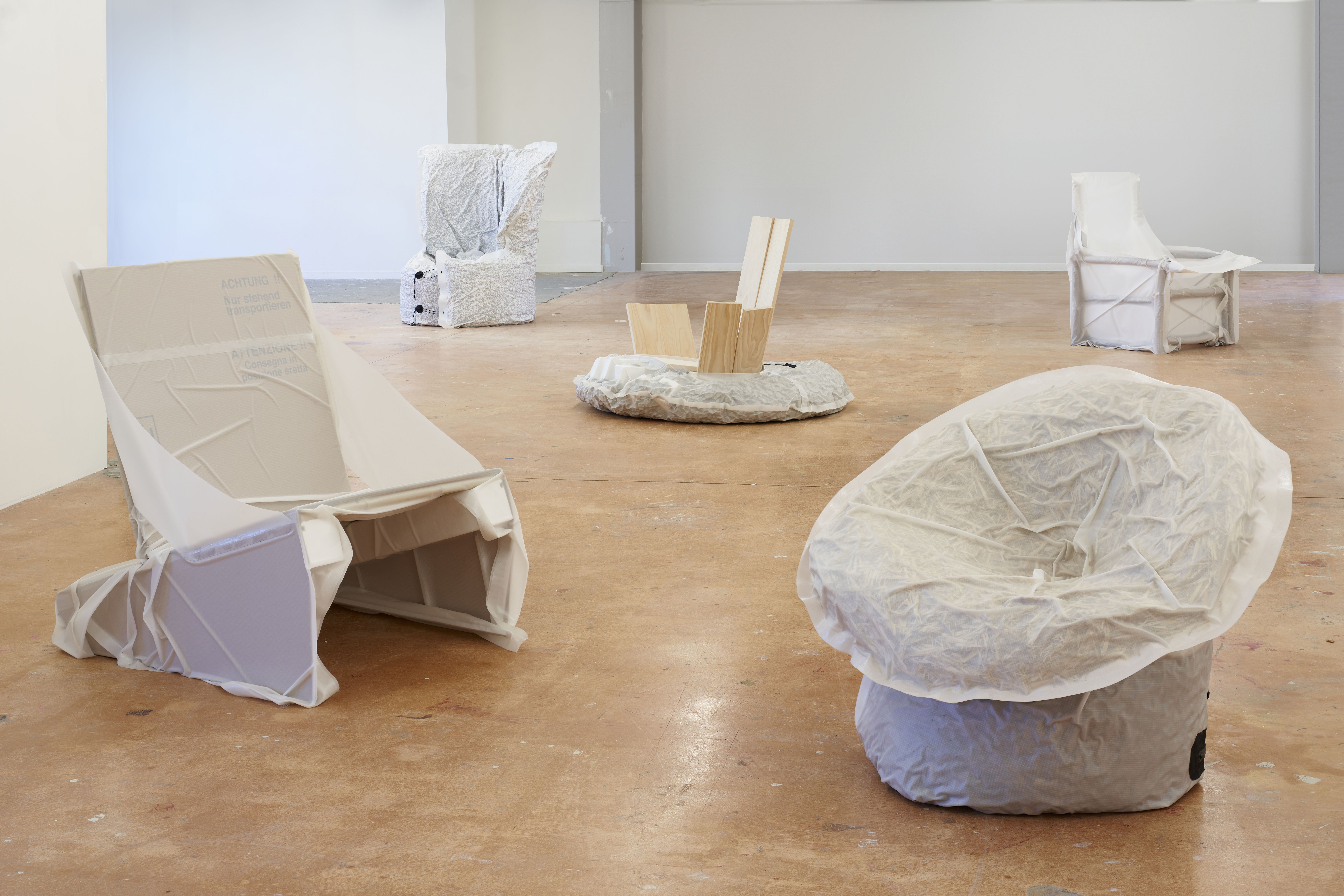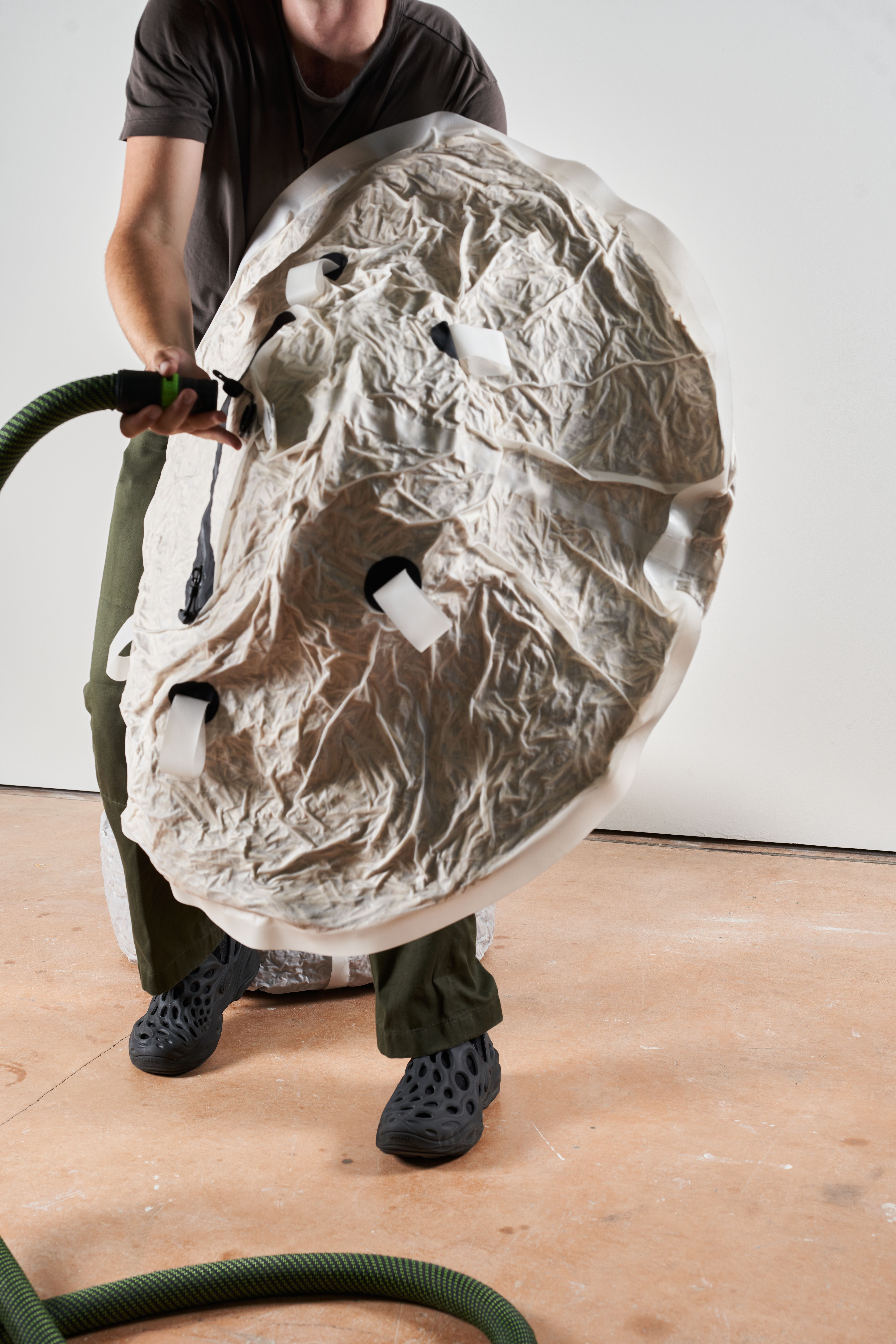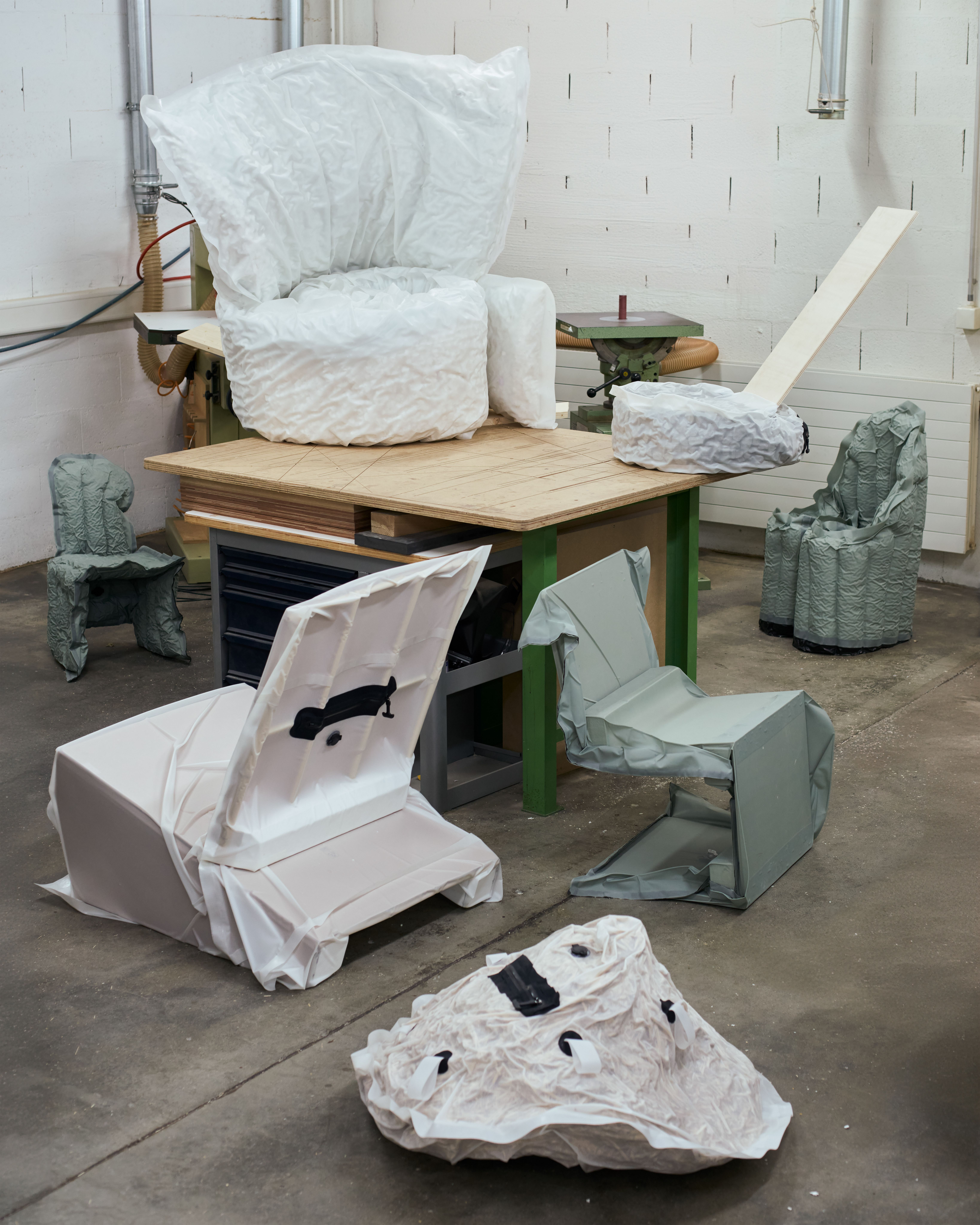 This project focuses on assembling objects using vacuum. A technique known as “jamming”, it increases friction between parts like glue while allowing for reversibility. By filling airtight bags with different materials, unique combinations have been created to meet the structural demands of furniture. Five chair prototypes showcase binding techniques that enable easy separation and recycling.